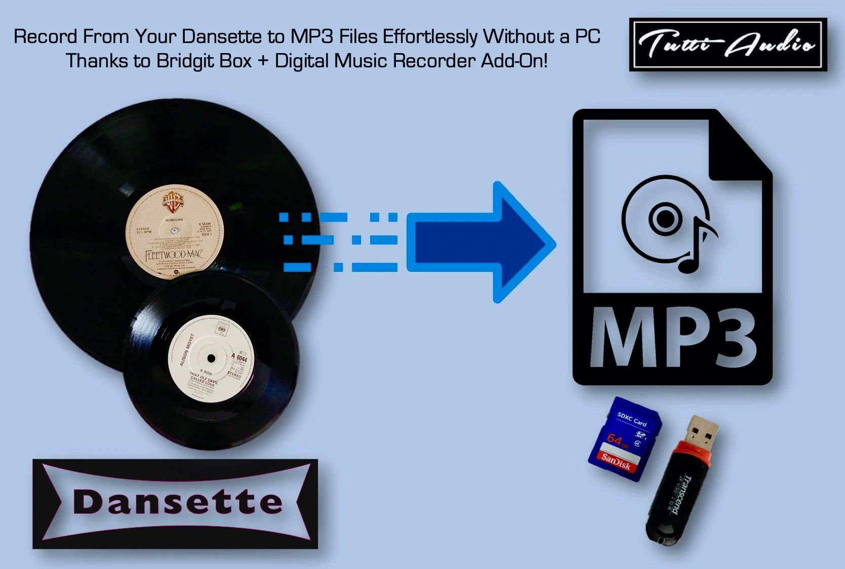 Thanks to Tutti Audio's revolutionary Bridgit Box you can now for the very first time record vinyl and old shellac 78's played on your Dansette direct to digital MP3 file format. Just add our Dansette digital recorder box - it's that easy!